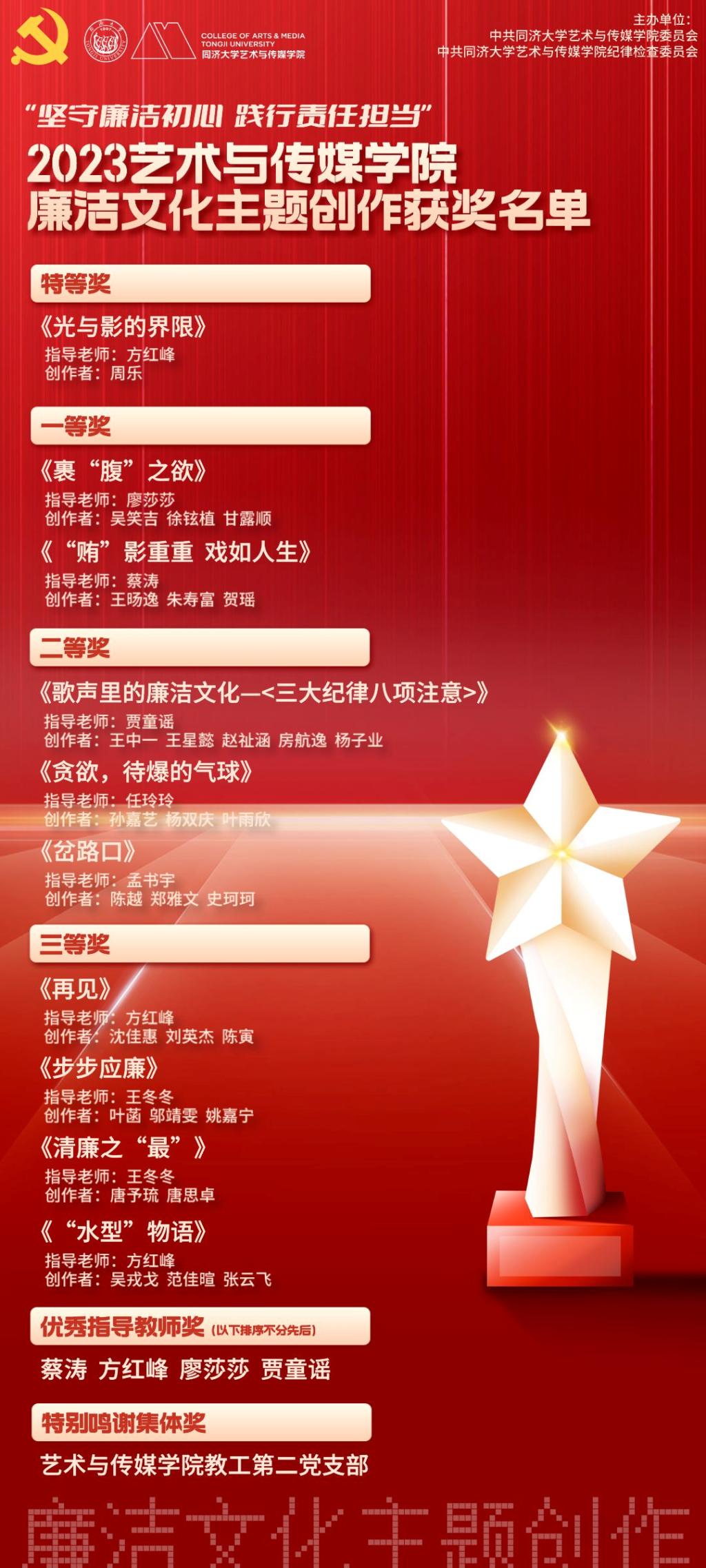 为积极响应学校关于推进校园廉洁文化建设的号召,艺术与传媒学院开展了廉洁文化建设双月活动,并于2023年春季学期和秋季学期接连发起两期廉洁文化主题创作活动,专业教师党员担纲指导,面向学生党员、发展对象、入党积极分子等征集开展廉洁文化主题创作,鼓励广大学生发挥专业特长,营造学院廉洁文化建设浓郁氛围。近日,艺术与传媒学院“坚守廉洁初心 践行责任担当”2023年廉洁文化建设总结大会在嘉定校区惟新馆党建室举行。