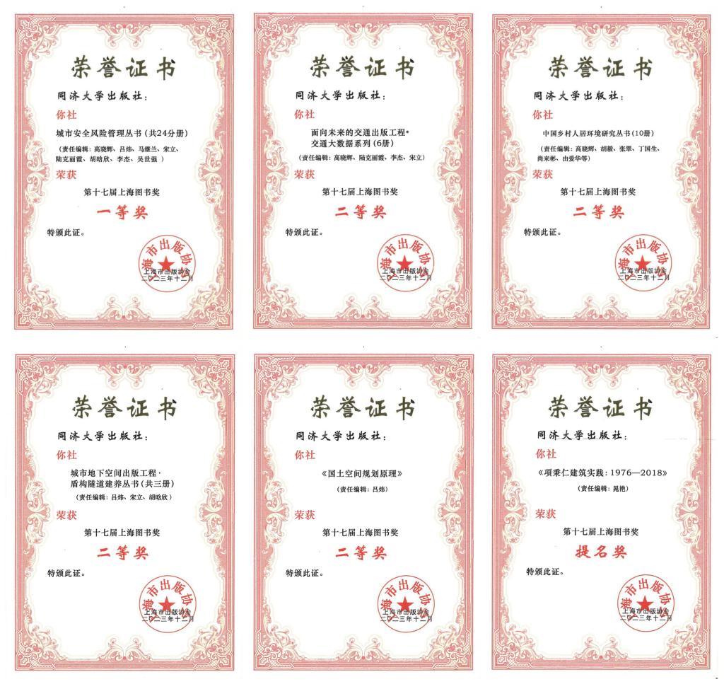 近日,第十七届上海图书奖评选结果正式揭晓,经专家初审、终评等环节,最终从2021年1月至2022年12月出版的参评图书中选出99种。其中,同济大学出版社“城市安全风险管理丛书”(24分册)获得一等奖,“面向未来的交通出版工程·交通大数据系列”(6册)、“中国乡村人居环境研究丛书”(10册)、“城市地下空间出版工程·盾构隧道建养丛书”(3册)和《国土空间规划原理》获得二等奖,《项秉仁建筑实践:1976—2018》获得提名奖。