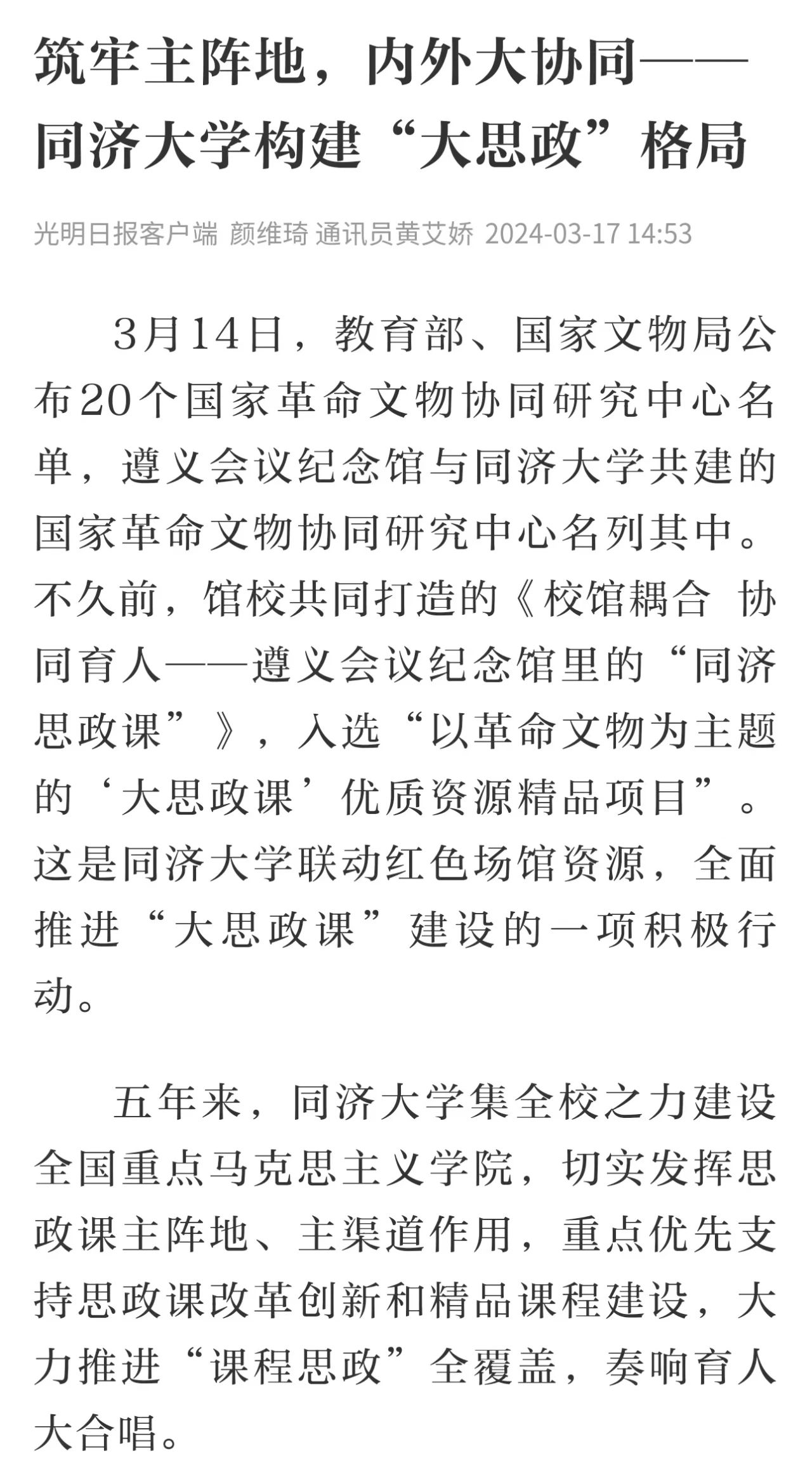 3月14日,教育部、国家文物局公布20个国家革命文物协同研究中心名单,遵义会议纪念馆与同济大学共建的国家革命文物协同研究中心名列其中。不久前,馆校共同打造的《校馆耦合 协同育人——遵义会议纪念馆里的“同济思政课”》,入选“以革命文物为主题的‘大思政课’优质资源精品项目”。这是同济大学联动红色场馆资源,全面推进“大思政课”建设的一项积极行动。