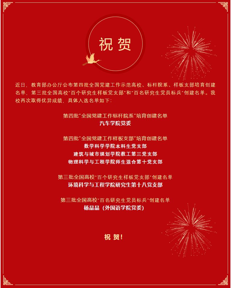 同济大学汽车学院党委入选为第四批“全国党建工作标杆院系”培育创建单位。数学科学学院本科生党支部、建筑与城市规划学院教工第三党支部、物理科学与工程学院师生混合第十党支部入选为第四批“全国党建工作样板支部”培育创建单位。环境科学与工程学院研究生第十八党支部入选为第三批全国高校“百个研究生样板党支部”创建单位。杨晶晶(外国语学院党委)入选为第三批全国高校“百名研究生党员标兵”。