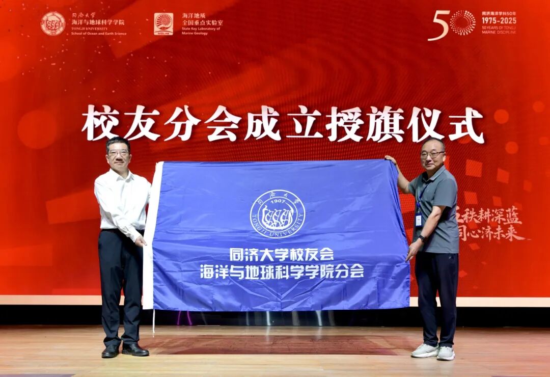 朱小杰代表学校向新成立的同济大学校友会海洋与地球科学学院分会授旗。