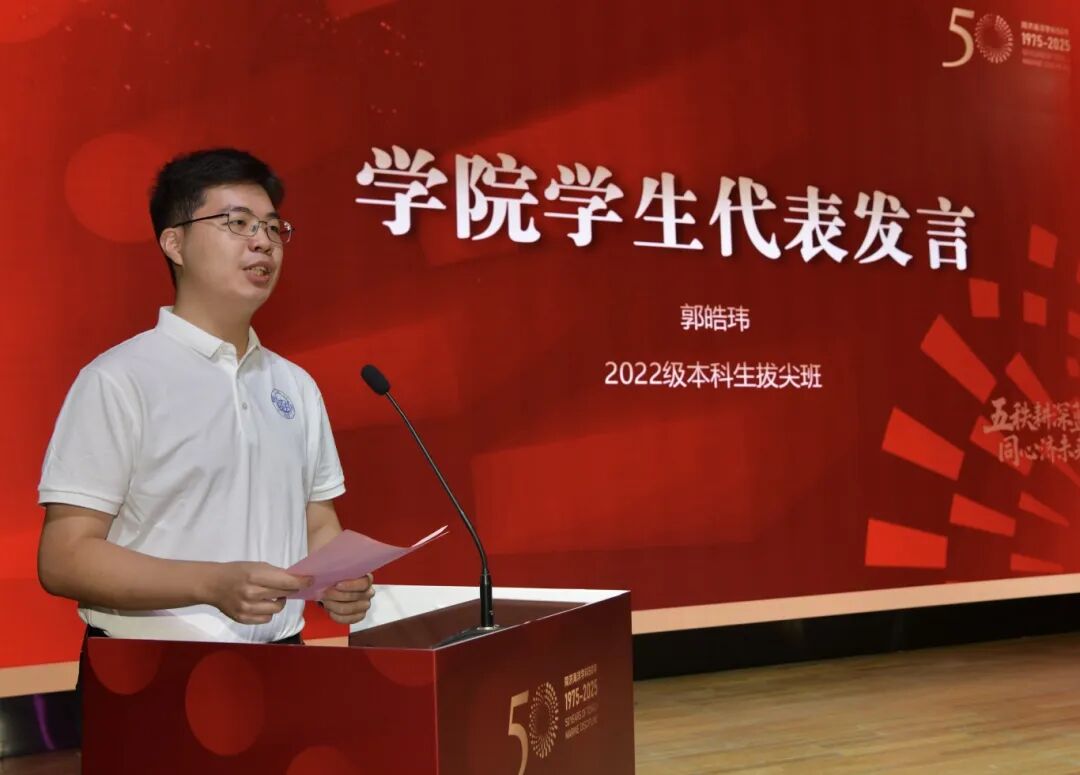 2022级本科生郭皓玮作为学生代表发言表示,个人的成长轨迹与学科、学院的发展紧密相连,将把课堂所学、科研所悟,转化为服务国家战略需求、推动人类海洋事业发展的实际行动,在海洋强国建设的壮阔蓝图上,奋力刻下属于同济海洋人的深蓝印记。