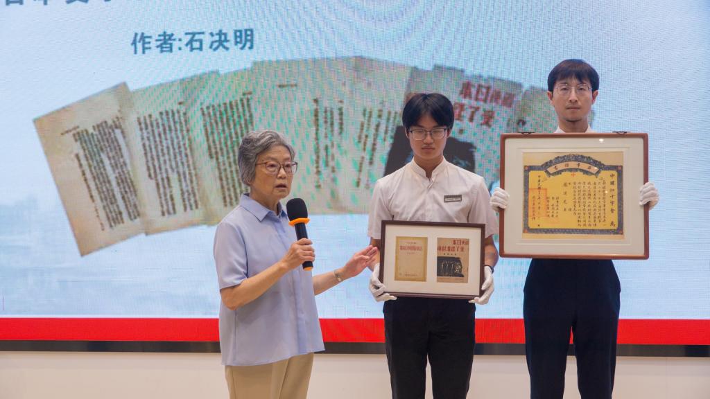 仪式上,石四箴简要介绍了其父石湘涛先生1936年所著《假使日本受了经济封锁》抗日丛书仿制件及其生前所用打字机,其母庞运芝女士1932年参与淞沪抗战救护工作所获得的中国红十字会奖章证书仿制件,以及石湘涛先生著作《今日之日本丛刊——战后日本财阀的复活》仿制件。同时,她还捐赠了其珍藏的美国学者所编著的《南京大屠杀——历史照片中的见证》写真集。