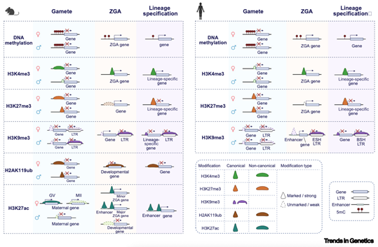 在哺乳动物的早期胚胎发育过程中,核心组蛋白修饰经历了广泛的重编程。在配子和受精卵中,多种组蛋白修饰,例如H3K4me3、H3K27ac等,都会呈现一种非经典的分布模式,从而在全能性建立中发挥独特的调控功能。而H3K27me3、H3K9me3等抑制性的组蛋白修饰也在胚胎基因激活及转座子表达中起到关键的调控作用。