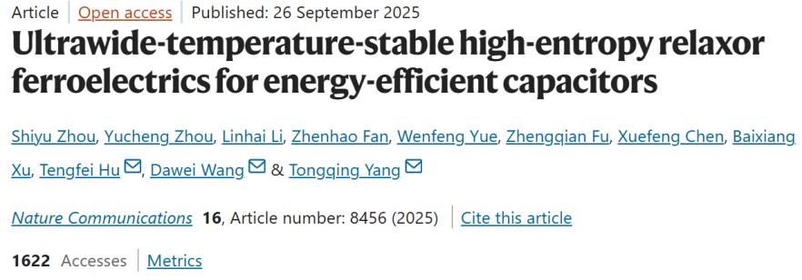 近日,材料科学与工程学院杨同青教授有关电介质储能电容器的研究成果以“Ultrawide-temperature-stable high-entropy relaxor ferroelectrics for energy-efficient capacitors”为题发表于《自然·通讯》期刊(Nature Communications)。