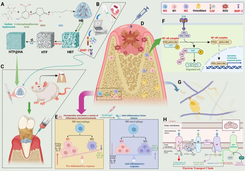 该研究提出“环境响应-时序释放”策略,设计了动态硼酸酯交联的多功能可注射水凝胶HTF@HA,可共载CGF与低剂量BMP-2。经动物实验和细胞实验证实,该材料在病变的炎症期可因酸性环境触发抗炎分子快速释放,在病变修复期则通过钙磷螯合作用实现BMP-2的持续释放,协同促进成骨与成血管。该体系集抗炎、抗氧化与成骨于一体,实现了“微环境响应+时序释放+多因子协同”的精准调控,为炎症相关牙周骨缺损的智能修复提供了新的研究策略。