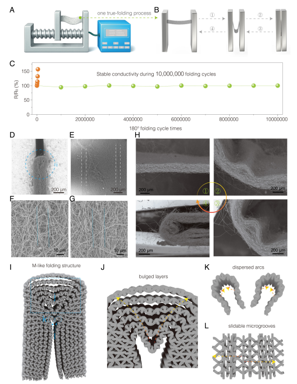制备出的CFMs超材料在导电率达到103S·m−1量级的同时能够经受107乃至无限次无损真折叠。这种特性是自然界不存在的,且唯有通过上述人工结构设计方可实现。折叠过程及其应力分散形成的结构变化和导电率稳定性展示在下图中。