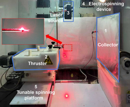 静电纺丝(electrospinning)是一项传统的纤维制造技术,其源头可追溯到1600年,但是直到1934年才设计出装置并实现聚合物纤维的静电纺丝制备;再到1960’s才揭示其中的关键现象“泰勒锥”;进入1990’s以后随着纳米科技的发展静电纺丝技术也终于走上了快车道。然而,在静电纺丝发展过程中,人们主要是通过调整仪器设备参数、实验环境参数、前驱液参数乃至针头改造等方式来实现纤维纺丝预期目标;而对于高压静电场中的泰勒锥超快作用过程一直无人问津,也无从入手。该论文首次将低功率红色激光束与超高压静电场中植入了蚕丝和藕茎两级仿生的泰勒锥超快反应前驱液相耦合,使含有碳纳米管的PAN前驱液在泰勒锥中的飞行组装温度和粘度等参数得以自由调控,从而创建了一套适用于各种高聚物复合纤维制备的“激光-静电场耦合仿生纺丝”新技术(LECBS),其基本装置如下: