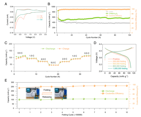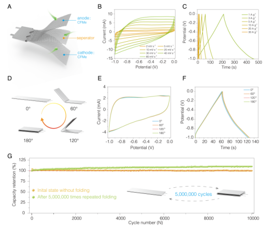 CFMs作为超折叠电极乃至作为超折叠储能器件的基底均表现出优异的超折叠电化学持续稳定性能(见下图)。