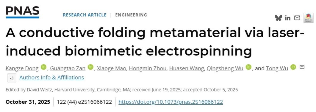 化学科学与工程学院吴彤团队变革百年电纺技术,创建激光诱导仿生方法,实现折叠电子超材料突破,成果发表于《美国国家科学院院刊》