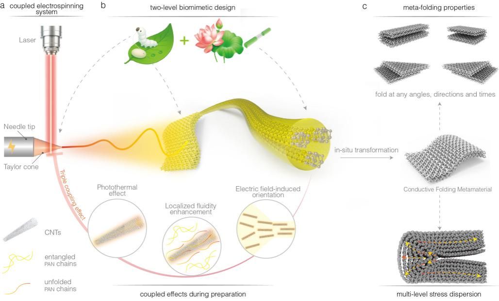 这种LECBS方法,可使聚合物纤维中的碳纳米管呈轴向分布、纤维直径显著变细、柔韧性大幅度提高、导电性和强度同时呈指数级增大。经过条件优化,得到无交叉粘连的含碳纳米管高聚物复合纤维后,经无氧梯度升温碳化即可获得目标产物折叠电子超材料(CFMs)。整体设计思路见下图。