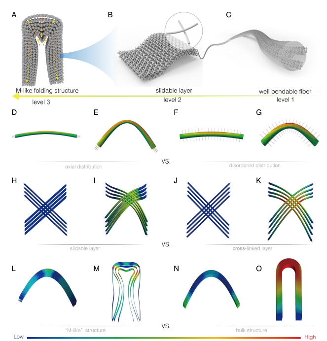 有限元力学模拟揭示CFMs超材料在折叠过程中的线、面、体全方位的应力分散机理: