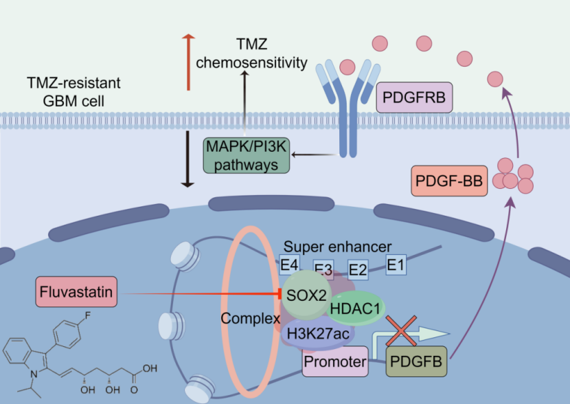 该研究首次发现在TMZ耐药GBM中,超级增强子(super-enhancers, SEs)复合体的关键组分SOX2存在过度表达。研究揭示了SOX2与组蛋白去乙酰化酶HDAC1在PDGFB基因SEs处发生协同活化,从而在化疗压力下维持致癌转录程序的新机制。进一步研究证实,通过基因敲低或使用氟伐他汀等小分子抑制剂靶向SOX2,能显著增强GBM对TMZ的敏感性,为克服临床耐药提供了新的潜在治疗策略。