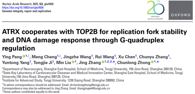 9月25日,钟春龙、张晶教授团队在《核酸研究》(Nucleic Acids Research)上发表了题为“ATRX cooperates with TOP2B for replication fork stability and DNA damage response through G-quadruplex regulation”的论著。