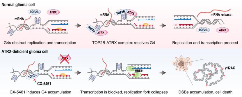 该研究首次发现,II型拓扑异构酶TOP2B作为G-四链体(G4)稳态的新调控因子,能够与染色质重塑因子ATRX功能性协作,在DNA复制过程中促进G4结构的修复。小分子抑制剂CX-5461通过干扰TOP2B在G4位点的结合,诱导G4积累、复制叉停滞和DNA损伤,表现出对ATRX缺陷胶质瘤细胞的选择性敏感性。CX-5461的作用机制不同于传统TOP2毒物(如etoposide),其特异性破坏ATRX-TOP2B协作,使G4相关复制应激显著增强。研究结果表明,TOP2B是G4调控的重要因子,ATRX缺陷型胶质瘤因依赖TOP2B功能而对CX-5461高度敏感,提示G4相关复制应激可作为ATRX缺陷型胶质瘤协同致死新疗法的潜在治疗靶点。