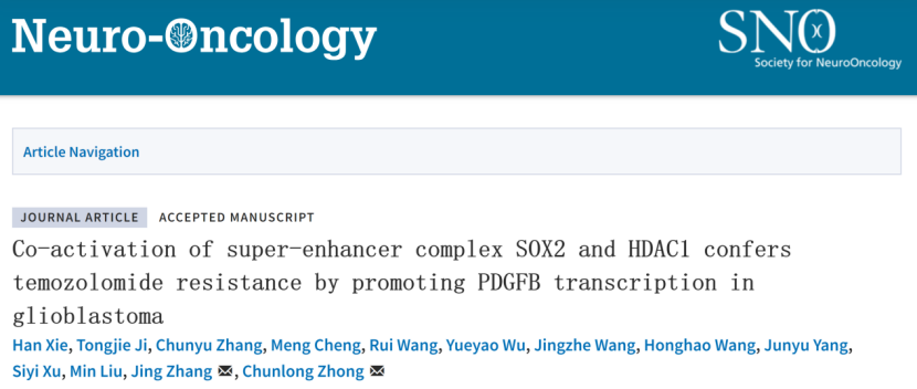 9月15日,钟春龙、张晶团队在《神经肿瘤》(Neuro-Oncology)在线发表了题为“Co-activation of super-enhancer complex SOX2 and HDAC1 confers temozolomide resistance by promoting PDGFB transcription in glioblastoma”的论著。