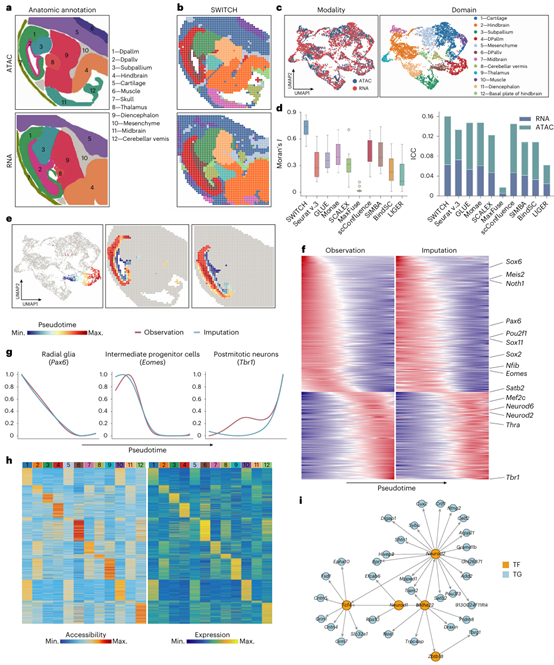 作者进一步将SWITCH应用于整合小鼠胚胎不同发育阶段的多组学数据,识别的空间域与形态学标注高度一致,能够保持清晰的空间域边界,并在Moran’s I与ICC等无监督指标上获得更优表现(图4)。基于Monocle3的皮层发育拟时序分析显示,从脑室带(VZ)到皮层板(CP)的时空梯度在两种模态中一致重现,表明整合的准确性。为了验证插补的准确性,作者使用RNA模态筛选出一系列随拟时序变化的基因,并发现其趋势在ATAC插补的表达中得到保留。此外,代表性的发育相关基因(如Pax6、Eomes、Tbr1)呈现与既往认知一致的变化模式。进一步地,结合插补后的表达与可及性开展峰–基因关联分析,并与峰–motif连接信息整合,SWITCH能够构建出具有空间域特异性的基因调控网络(GRN)。