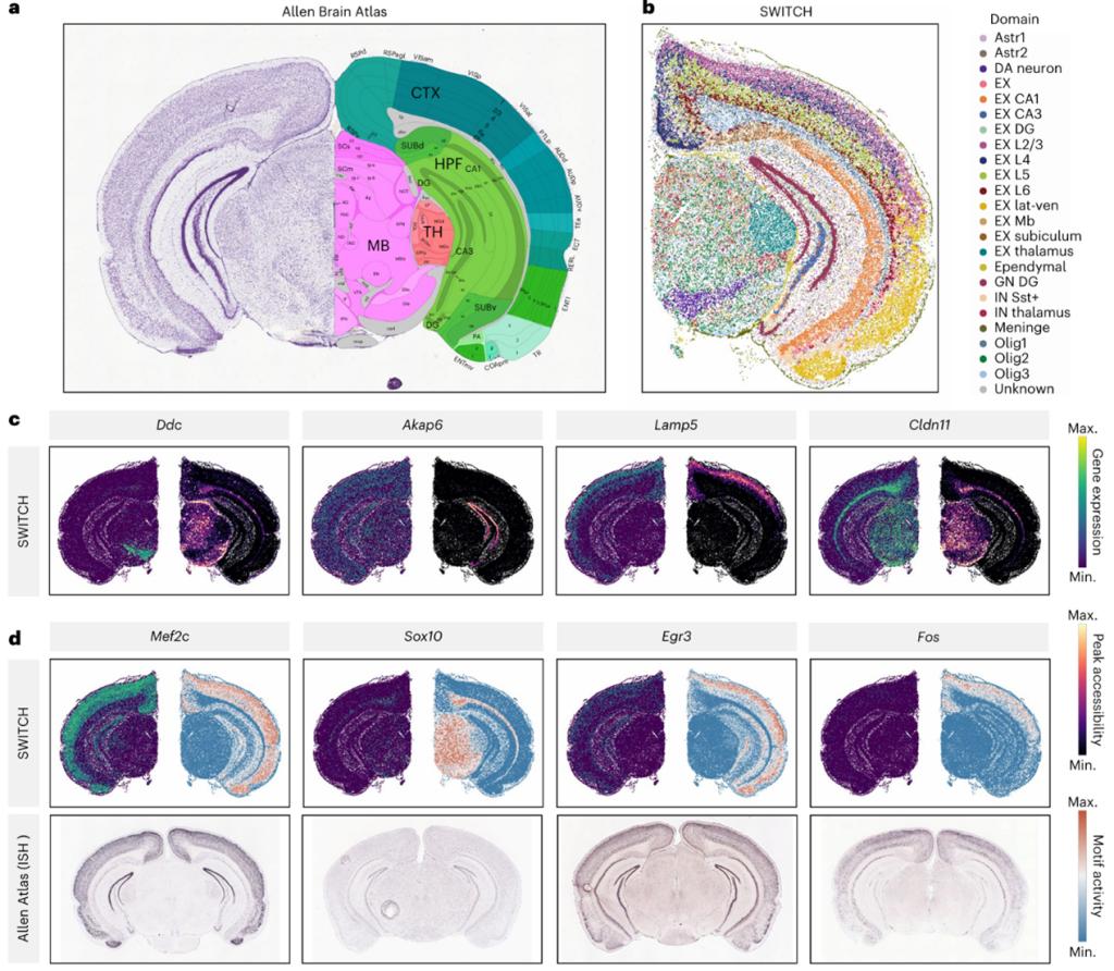 SWITCH的模块化设计使其能够很容易扩展至单细胞与空间组学的跨模态整合。作为示例,作者整合了小鼠大脑的空间转录组(Spatial Transcriptomics,ST)与单细胞ATAC数据(图5)。以Allen Brain Atlas为参照,SWITCH在ST切片中能够识别细粒度的解剖结构(如皮层L1–L6)。在由ST向ATAC的表达翻译中,作者系统比较了基因表达与其对应转录起始位点(Transcription Start Site,TSS)可及性的空间分布,观察到三类情形:其一,基因呈现明确的空间模式而对应TSS不显著;其二,TSS呈现空间模式而基因不明显;其三,二者在少数情况下具有一致的空间图谱。进一步基于插补的ATAC估计转录因子活性分数,可见与相应基因表达具有良好一致性,并与通过Allen的原位杂交(In Situ Hybridization,ISH)图像得到验证,表明推断的可及性与调控活性具有较高准确性与生物学可解释性。
