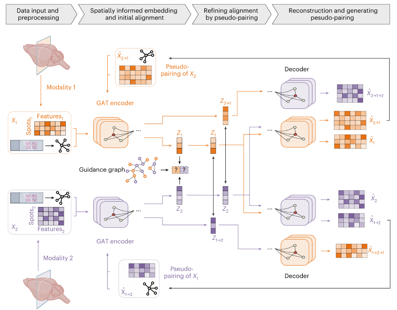 模型的框架主要包含了三个部分:空间感知编码、两阶段对齐和循环映射(图1)。(1)空间感知表征。针对每一模态,基于空间坐标构建邻近图,引入GAT编码器学习空间感知的低维嵌入;再以模态特异的概率解码器回映至原特征空间。(2)两阶段对齐。先利用知识引导的特征图(guidance graph)开展对抗式初始对齐,得到跨模态的粗对齐表征;随后通过跨模态解码生成“伪配对”,并最小化其与原嵌入的差异,迭代细化对齐质量。(3)循环映射一致性。通过“模态1→模态2→模态1”的闭环一致性约束,在无真实配对的情形下对翻译结果进行自洽校验,从而提高补全的可用度与稳定性。