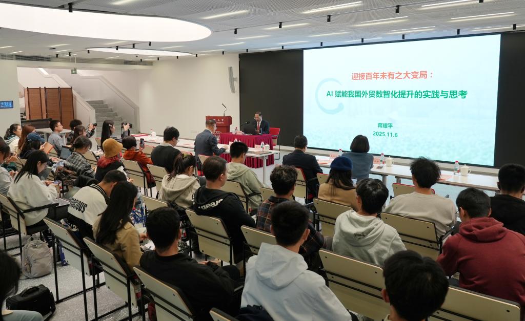 蒋耀平从《国务院关于深入实施“人工智能+”行动的意见》讲起,指出当今世界正处于百年未有之大变局,科技革命与产业变革深度交织,人工智能正成为重塑国际竞争格局的关键力量。“技术创新唯有实现科研、产品、市场的良性循环,才能真正转化为经济增长与国家竞争力”。他从AI赋能货物贸易、服务贸易、数字贸易3个维度系统阐释了人工智能对我国外贸结构升级的深远影响。勉励青年学子树立创新思维与市场意识,在AI时代“让技术更懂商业,让商业更懂科技”,以跨界融合的学习与实践实现个人成长与时代价值的统一。