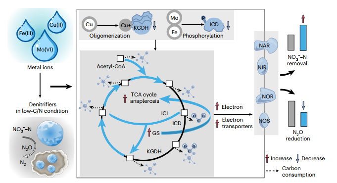 针对低碳氮比(C/N)污(废)水生物脱氮依赖外碳源同时排放大量温室气体的问题,创新提出一种代谢重编程策略(图3),通过引导碳通量进入乙醛酸分流(GS)途径,强化三羧酸循环回补反应,实现低C/N废水高效脱氮并减少温室气体排放,其中总氮去除率提升196.2%、氧化亚氮排放减少51.3%。该效应源于异柠檬酸脱氢酶和α-酮戊二酸脱氢酶被抑制,导致异柠檬酸积累从而激活乙醛酸分流关键酶异柠檬酸裂解酶,优先启动GS驱动的回补代谢。这种碳代谢重编程策略可降低脱氮有机碳需求,提升碳源利用效率。论文第一作者为同济大学环境科学与工程学院博士研究生彭浩进,通讯作者为陈银广教授。