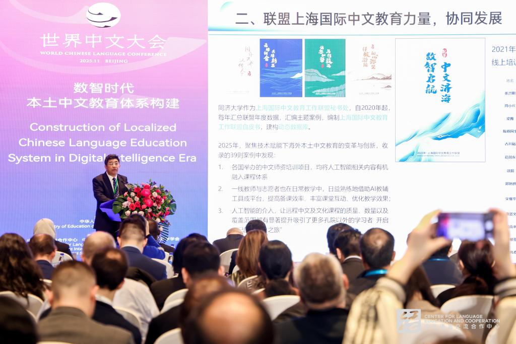 11月14日,2025世界中文大会在北京开幕,中共中央政治局常委、国务院副总理丁薛祥出席开幕式并发表主旨讲话。常务副校长吕培明应邀出席会议,并在“数智时代本土中文教育体系构建”论坛上作了题为《数智赋能 中文济海:同济大学人工智能赋能国际中文教育的实践与思考》的邀请发言。