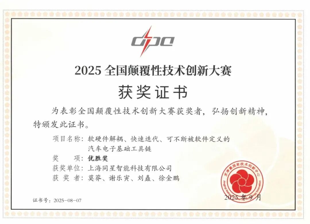 近日,同济大学科技园嘉定园企业、汽车学院校友企业同星智能凭借“软硬件解耦、快速迭代、可不断被软件定义的汽车电子基础工具链”项目,荣膺2025全国颠覆性技术创新大赛优胜奖。这是同星智能在获得金辑奖、AITX领航创新技术奖、测量与标定技术奖后,再次获得的又一重要荣誉。