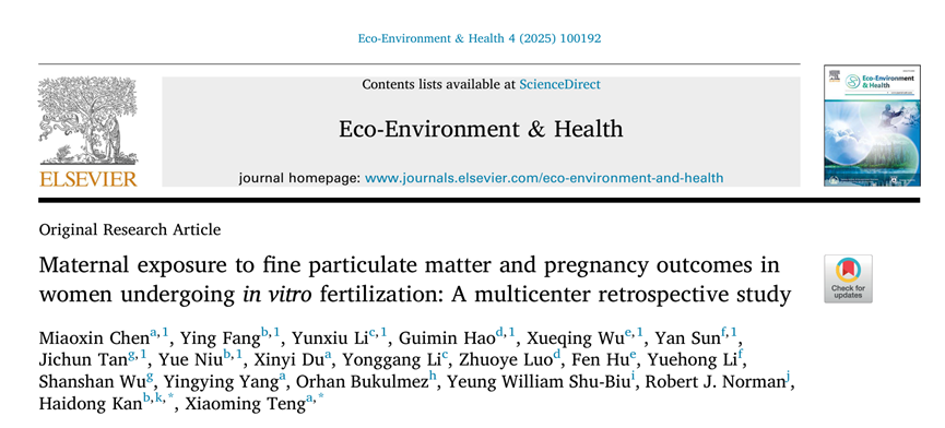 基于以上背景,同济大学附属妇产科医院滕晓明教授团队联合复旦大学公共卫生学院阚海东教授团队领衔国内6个生殖中心团队在环境科学领域期刊《生态环境与健康》(Eco-Environment & Health)上发表题为“Maternal exposure to fine particulate matter and pregnancy outcomes in women undergoing in vitro fertilization: A multicenter retrospective study”的研究论文。该研究采用回顾性队列研究设计,收集上海、云南、河北、山西、福建和辽宁6个三级医院的IVF临床数据,量化了我国环境PM2.5暴露与IVF活产结局的关联,并识别了敏感的暴露时间窗口、关键的失败时间节点以及易感人群。
