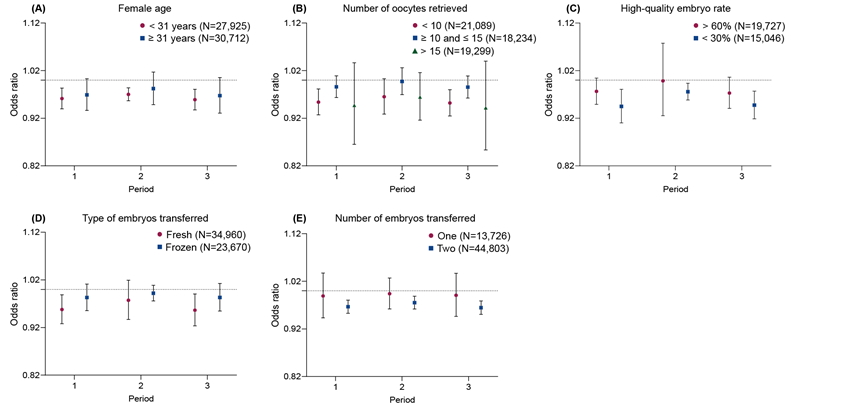 图3. 卵泡生长期不同阶段PM2.5暴露与活产关联,根据(A)年龄,(B)取卵数,(C)高质量胚胎率,(D)移植胚胎类型和(E)移植胚胎数分层结果