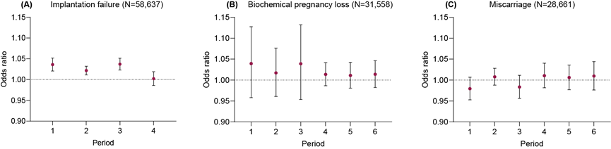 图2. 各暴露时间窗口PM2.5暴露与(A)移植失败,(B)生化妊娠丢失和(C)流产的关联