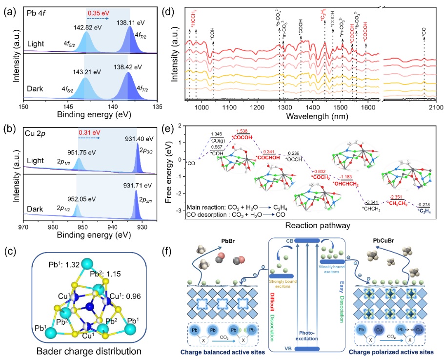 这一合成策略不仅丰富了三维金属卤化物的结构类型,[Cu4X4]簇的引入还显著提升了材料的载流子迁移效率,有效抑制了光生电子-空穴的复合。此外,新构筑的双金属框架中形成了本征电荷极化的不对称Cuᴵ–X–Pbᴵᴵ卤素桥联异双金属位点,为CO2还原反应营造了有利的催化微环境。光催化性能测试表明,该材料能够在纯水体系下能高效将CO2还原为乙烯,并展现出优异的C2产物选择性。机理研究揭示,不对称的Cuᴵ–X–Pbᴵᴵ活性位点可有效稳定*COCOH关键反应中间体,促进C–C偶联过程,是实现高选择性生成C2产物的重要原因。