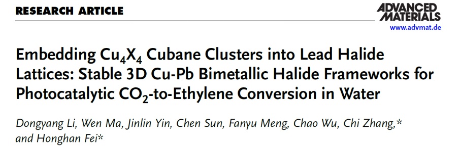 化学科学与工程学院费泓涵、张弛团队通过嵌入Cu4X4立方烷构筑Cu-Pb双金属卤化物框架,实现了水相光催化CO2还原制乙烯,成果发表于《先进材料》