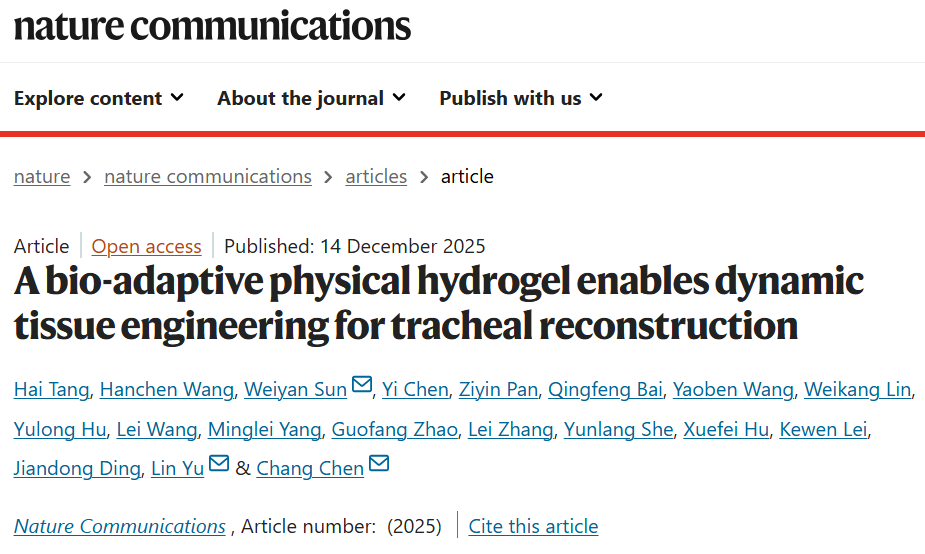 近日,同济大学附属上海市肺科医院陈昶教授团队联合复旦大学俞麟教授团队,在国际学术期刊《自然·通讯》(Nature Communications)上发表题为“A bio-adaptive physical hydrogel enables dynamic tissue engineering for tracheal reconstruction”的研究成果。该研究从组织工程的基本逻辑出发,系统提出并验证了动态组织工程(DTE)在气管再生中的关键作用,为长段气管缺损这一长期困扰胸外科与再生医学领域的难题,提供了全新的理论框架与技术路径。