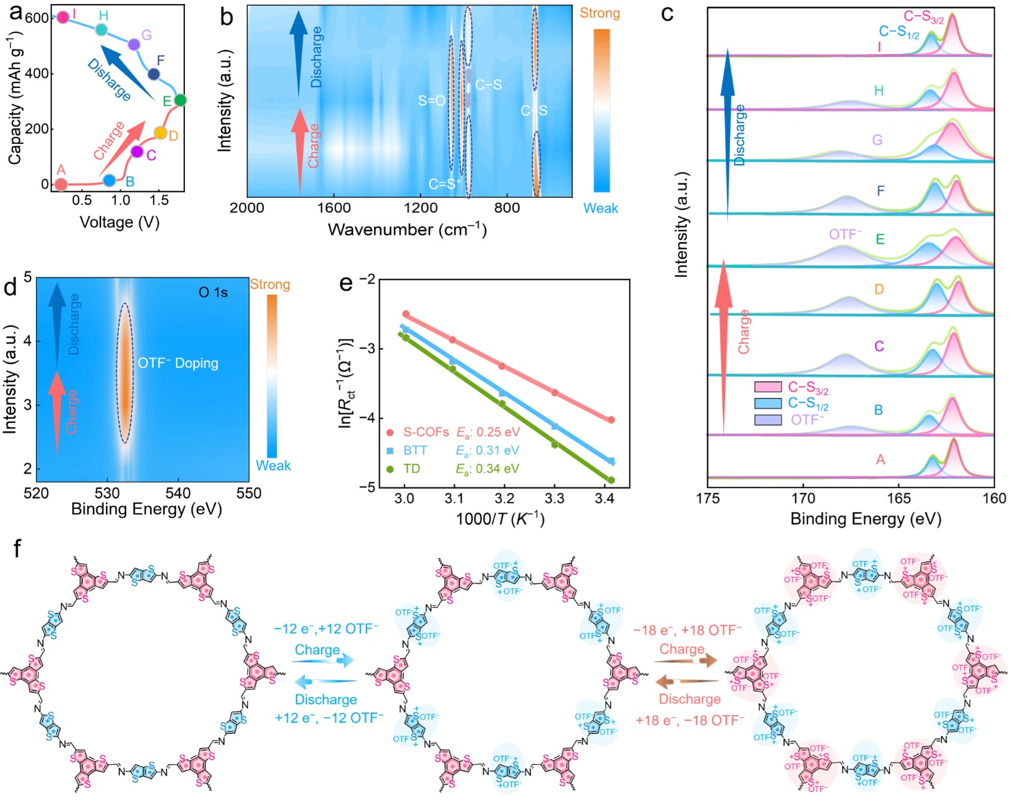 理论计算表明,S-COFs正极与CF3SO3−阴离子间存在强相互作用,稳定的两步30 e−阴离子共配位促进电极/电解质界面电荷累积,显著提高了电荷存储容量。