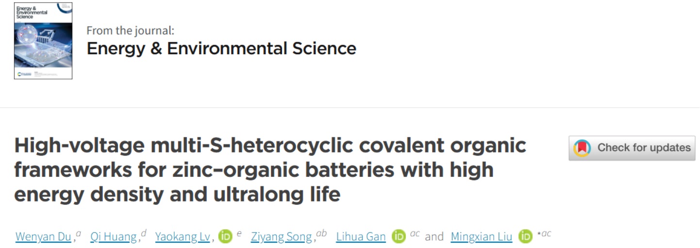 化学科学与工程学院刘明贤团队设计多硫杂环共价有机框架应用于高能量密度水系锌-有机电池,成果发表于《能源与环境科学》