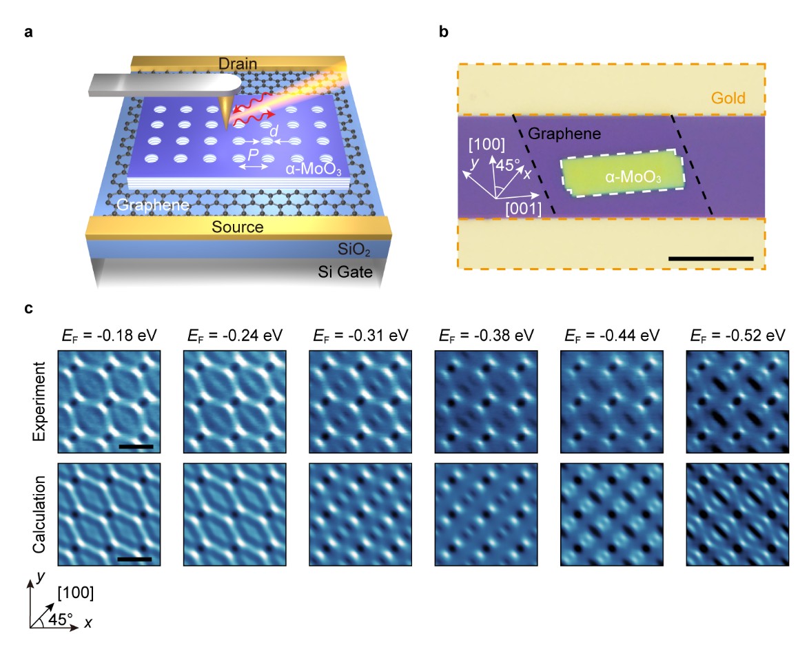 为解决这一难题,同济大学物理科学与工程学院王占山和程鑫彬团队的江涛教授,联合美国纽约城市大学Andrea Alù教授、中南大学倪祥教授、韩国浦项科技大学Kyoung-Duck Park教授,设计并制备了α-MoO3极化激元晶体与石墨烯的异质结电学器件。该结构巧妙结合了二维范德华材料α-MoO3所具有的低损耗、各向异性声子极化激元特性,以及石墨烯优异的电学可调性,实现了对光传播行为的主动调控。团队首先在α-MoO3上刻蚀出周期性纳米孔阵列,形成声子极化激元晶体,再与单层石墨烯堆叠形成异质结。通过施加背栅电压调控石墨烯的载流子浓度,即可改变其费米能级(EF)与光学性质,从而连续、动态地调制整个异质结构的光学行为。1月3日,相关研究成果以“Dynamic tuning of Bloch modes in anisotropic phonon polaritonic crystals”为题,发表于光学领域知名期刊《光:科学与应用》(Light: Science & Applications)。