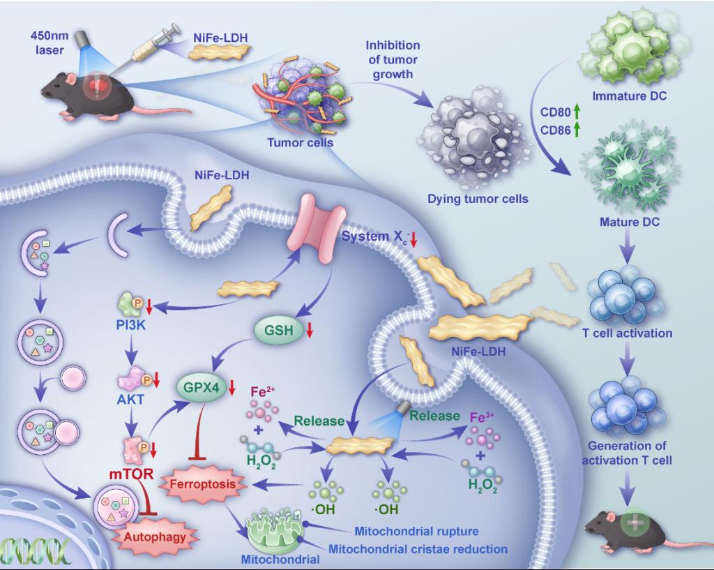 光敏NiFe-LDH通过产生活性氧、诱导铁死亡及自噬来抑制肿瘤生长并激活肿瘤免疫的TC-1细胞功能机制示意图