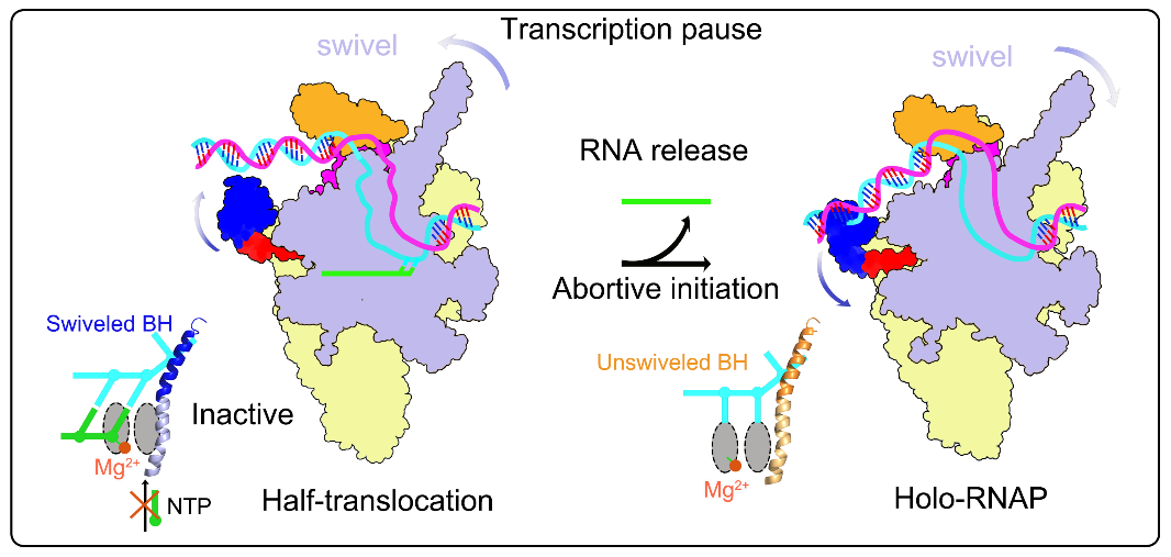 研究发现,当新生RNA从6个核苷酸延伸至7个核苷酸时,其5′端与σ因子σ3.2区域发生空间位阻冲突,诱导RNA聚合酶发生整体“swivel”构象变化并伴随上游DNA解旋,形成被称为“scrunched”的转录泡结构。这一构象重排导致活性中心处于半转位状态,从而稳定形成一个功能性的起始暂停中间体。该中间体同时连接后续延伸与流产转录两条途径,构成转录起始阶段的重要调控检查点,对于决定RNA聚合酶能否顺利进入稳定延伸状态具有核心作用。这一发现从结构层面确立了早期转录过程中“起始暂停”这一调控节点的分子基础。