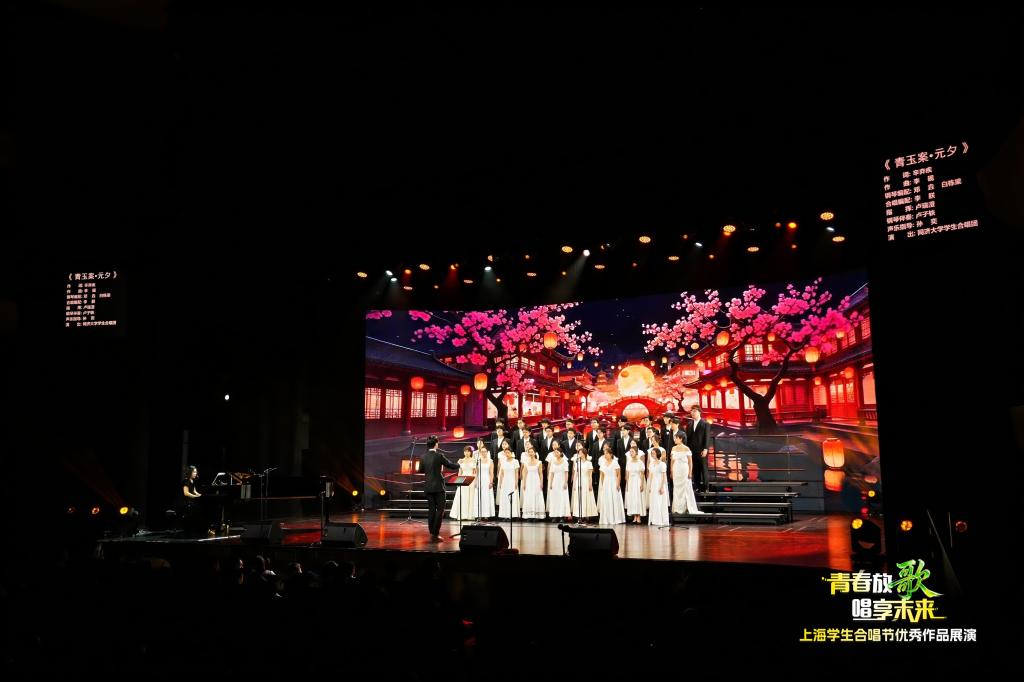 同济大学学生合唱团在展演中演绎了两首风格迥异的合唱作品——古诗词混声合唱《青玉案·元夕》与无伴奏合唱《牧歌》。