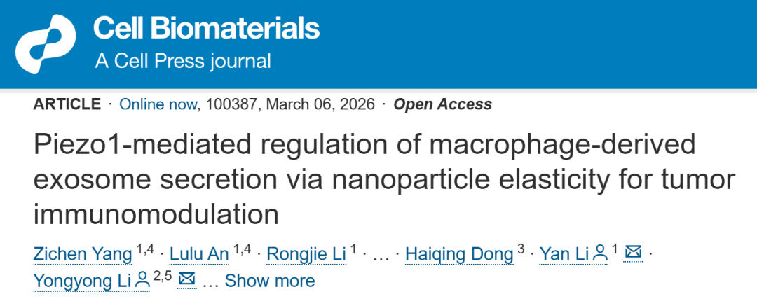 近日,同济大学医学院李永勇/李艳团队在《细胞•生物材料》(Cell Biomaterials)上发表题为“Piezo1-mediated regulation of macrophage-derived exosome secretion via nanoparticle elasticity for tumor immunomodulation”的文章。