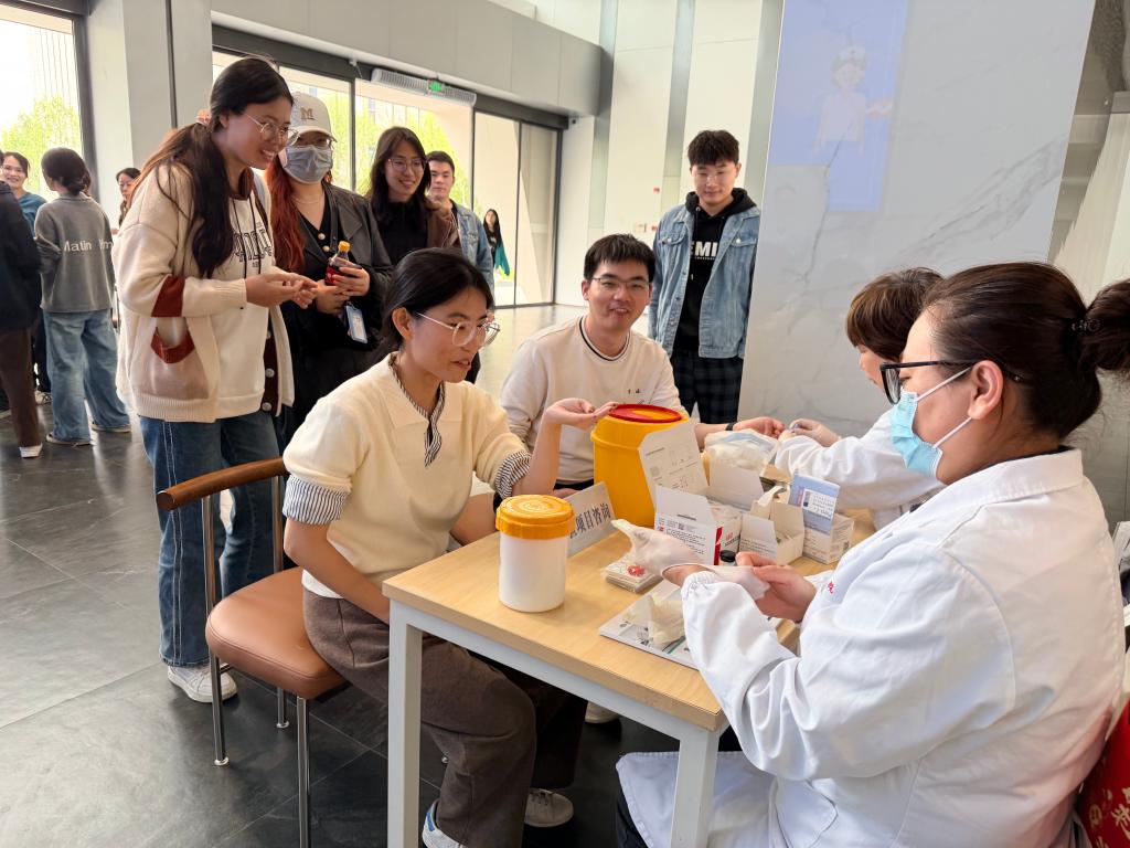 在免费便民健康服务区,师生们早早前来排队等候、积极参与体验,问诊、检测、咨询的队伍全程有序绵延。校医院医护人员为到场师生提供血压测量、血糖检测等基础健康筛查服务,操作专业细致,全程高效有序,让师生在午休时段就能快速完成基础健康检查,直观了解自身健康基础状况。