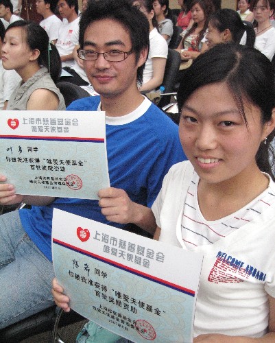 6月24日,两名上海同济大学医学院的学生手持获得的“唯爱天使基金”证书。当日,上海市慈善基金会向100余位将赴西部工作的复旦大学、上海交通大学、同济大学、上海中医药大学等四所上海高校的医学院的大学生,发放首批“唯爱天使基金”,以鼓励他们毕业后为国家的医学事业做贡献。