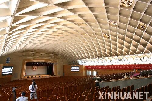 9月7日,几名记者在上海同济大学大礼堂采访。同济大学大礼堂改建后的屋顶采用高科技隔热瓦,部分天窗打开后可与侧窗形成自然的对流通风。