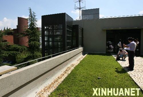 9月7日,几名记者在上海同济大学文远楼屋顶采访。文远楼始建于1953年,该楼屋顶在改造中采用无土种植草皮技术绿化,并设计雨水收集系统。 新华社记者庞兴雷摄
