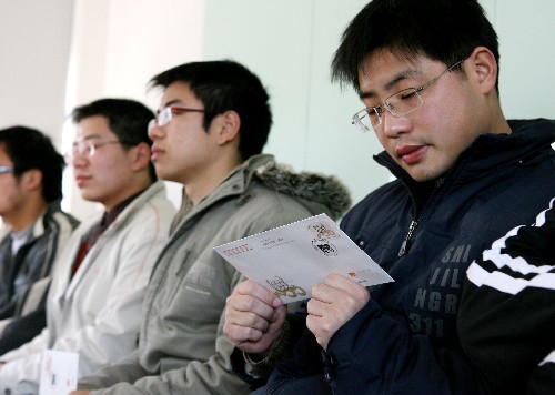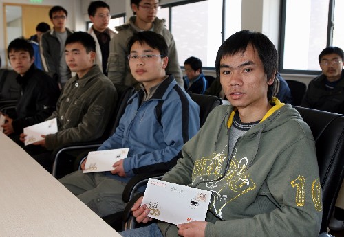 当日,来自贵州织金的同济大学学生班国远(前右一)领到助学金。 3月4日,来自湖南郴州的同济大学学生徐德智(右一)领到助学金。 2008-03-05 新华网贵州频道 新华社记者 刘颖 摄