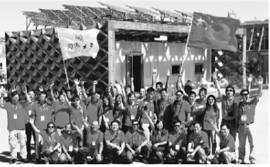 同济大学的参赛代表应邀参加在西班牙举行的“2012全球太阳能十项全能比赛”,在参赛作品—“复合外皮生态住宅”建筑前合影。