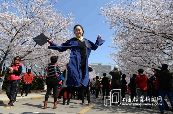 3月27日,同济大学四平校区,一名毕业生在樱花树下高高跃起拍照留念。 (摄影:赖鑫琳)