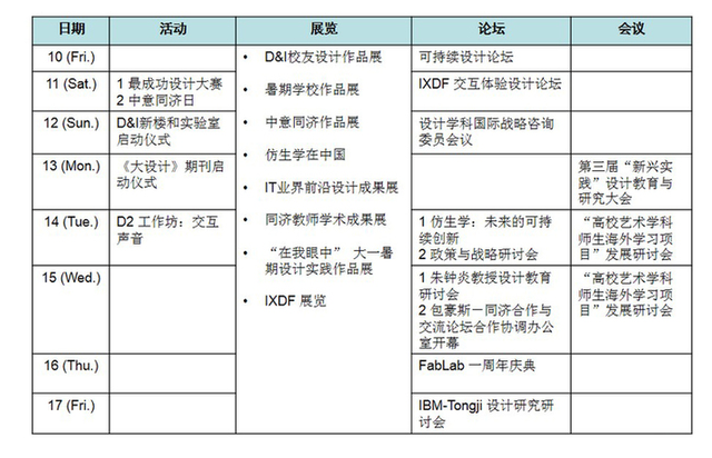 据悉,本次设计周的活动主题为“新空间”,涵盖工业设计,平面设计、交互设计、创新教育、仿生学研究、可持续发展等多重领域,展现了现代设计在众多领域、不同层次的发展成就。从10月10日开始到10月17日,期间,20余场展览、会议、论坛等活动将陆续开展。