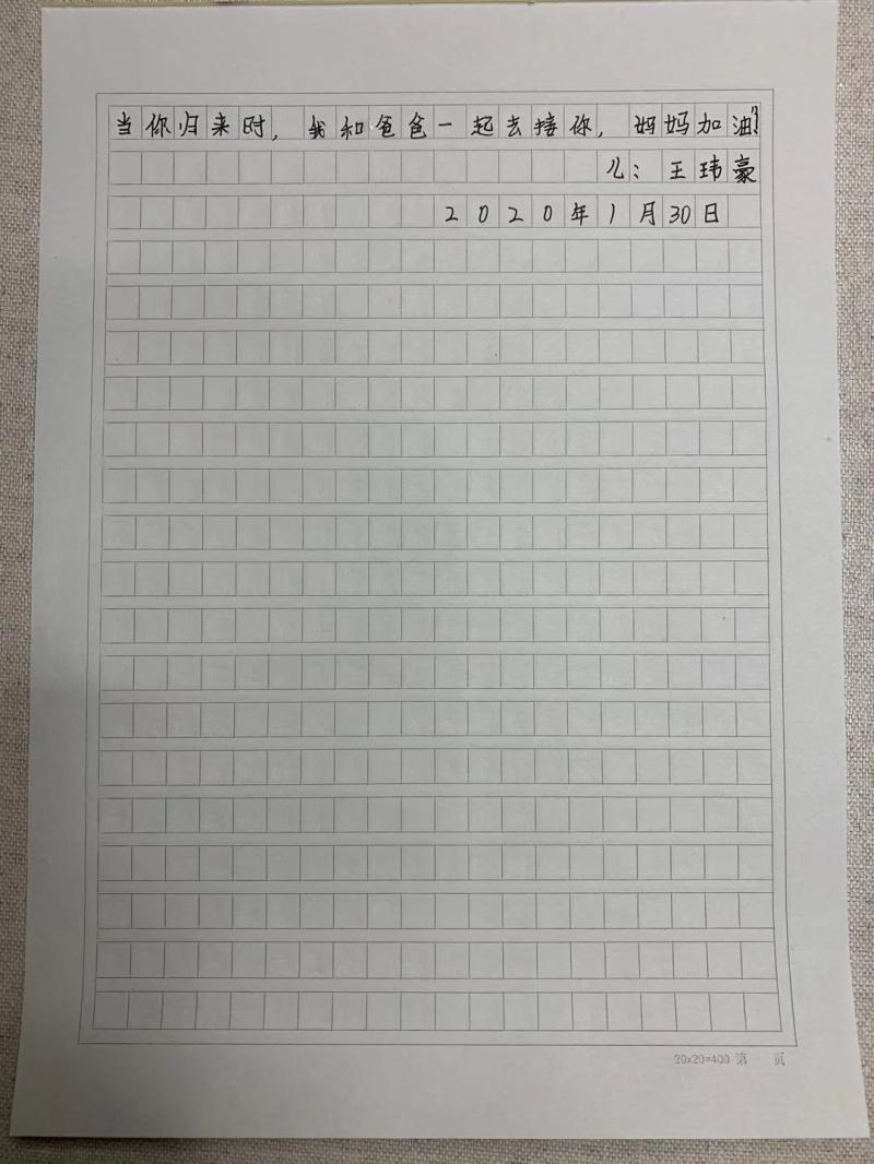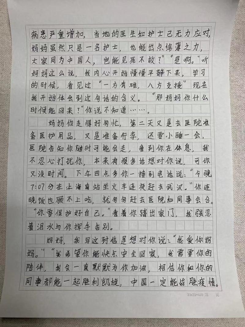 妈妈,我写这封信是想对你说:“我爱你妈妈,我希望你能快点安全回家,我需要你的陪伴,我会一直默默为你加油,相信你和你的同事都能一起胜利凯旋,中国一定能战胜疫情。当你归来时,我和爸爸一起去接你,妈妈加油!”