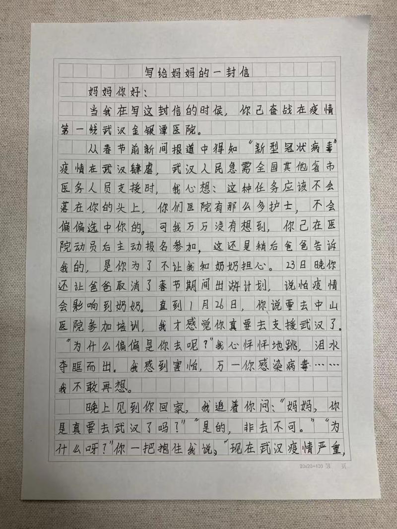 从春节前新闻报道中得知“新型冠状病毒”疫情在武汉肆虐,武汉人民急需全国其他省市医务人员支援时,我心想:这种任务应该不会落在你的头上,你们医院有那么多护士,不会偏偏选中你的,可我万万没有想到,你已在医院动员后主动报名参加,这还是稍后爸爸告诉我的,是你为了不让我和奶奶担心。23日晚你还让爸爸取消了春节期间出游计划,说怕疫情会影响到奶奶,直到1月26日,你说要去中山医院参加培训,我才感觉你真要去支援武汉了。“为什么偏偏是你去呢”,我心怦怦地跳,泪水夺眶而出。我感到害怕,万一你感染病毒……我不敢再想。